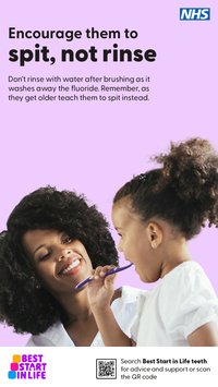 - "Encourage them to spit not rinse" which is to encourage children to spit not rinse as they get older