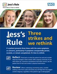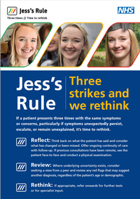 Jess’s Rule is a patient safety initiative in primary care, supporting GP teams to critically re-evaluate if a patient presents three times, with the same or escalating symptoms or concerns and an existing treatment plan is not working.